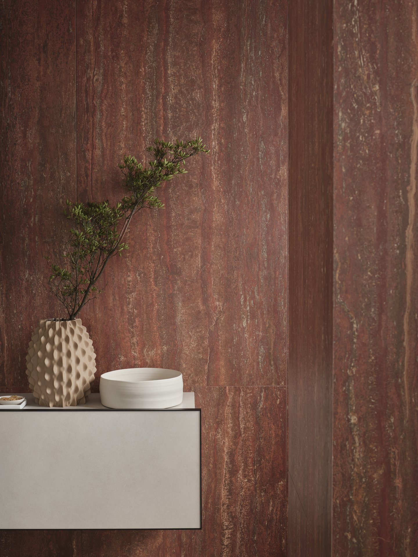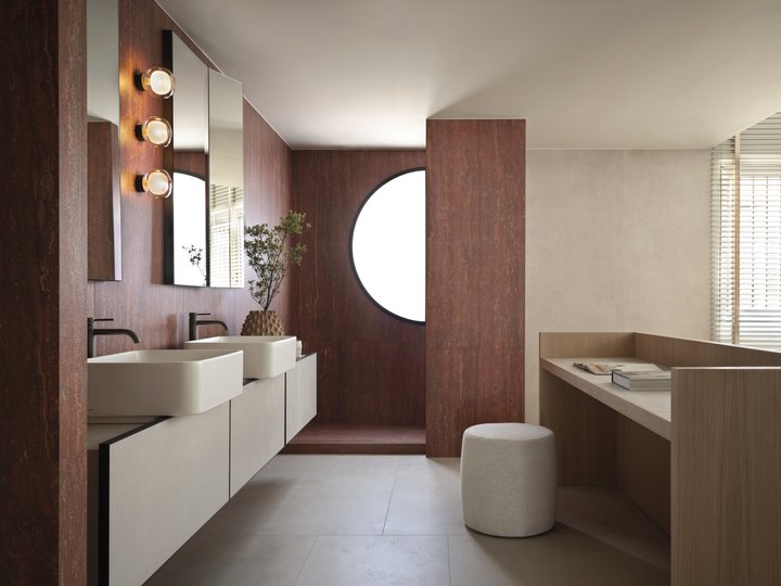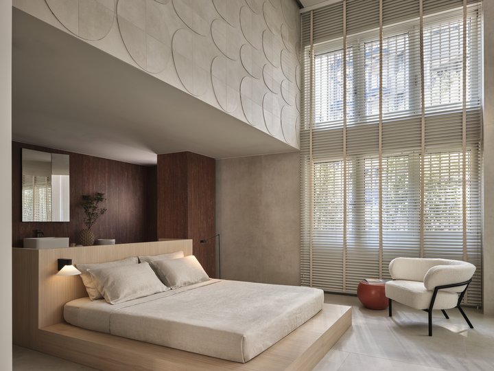 Il risultato è un profondo dialogo tra superfici e proporzioni che definisce l’intero ambiente, celebrando l'incontro armonioso tra rigore formale e nobiltà della materia.