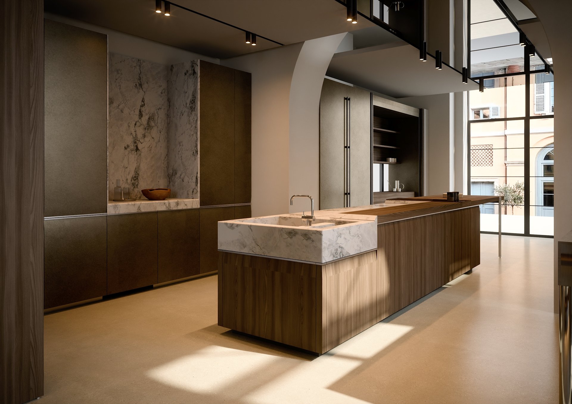 Il concept lavora sulla scomposizione della percezione attraverso l’uso degli specchi come strumenti narrativi: moltiplicando i punti di vista, l'allestimento non si limita a esaltare la qualità costruttiva e la ricercatezza materica, ma restituisce la realtà dell’interazione fisica tra corpo e ambiente. In questo gioco di rimandi e prospettive, la cucina emerge come un’architettura sensibile.