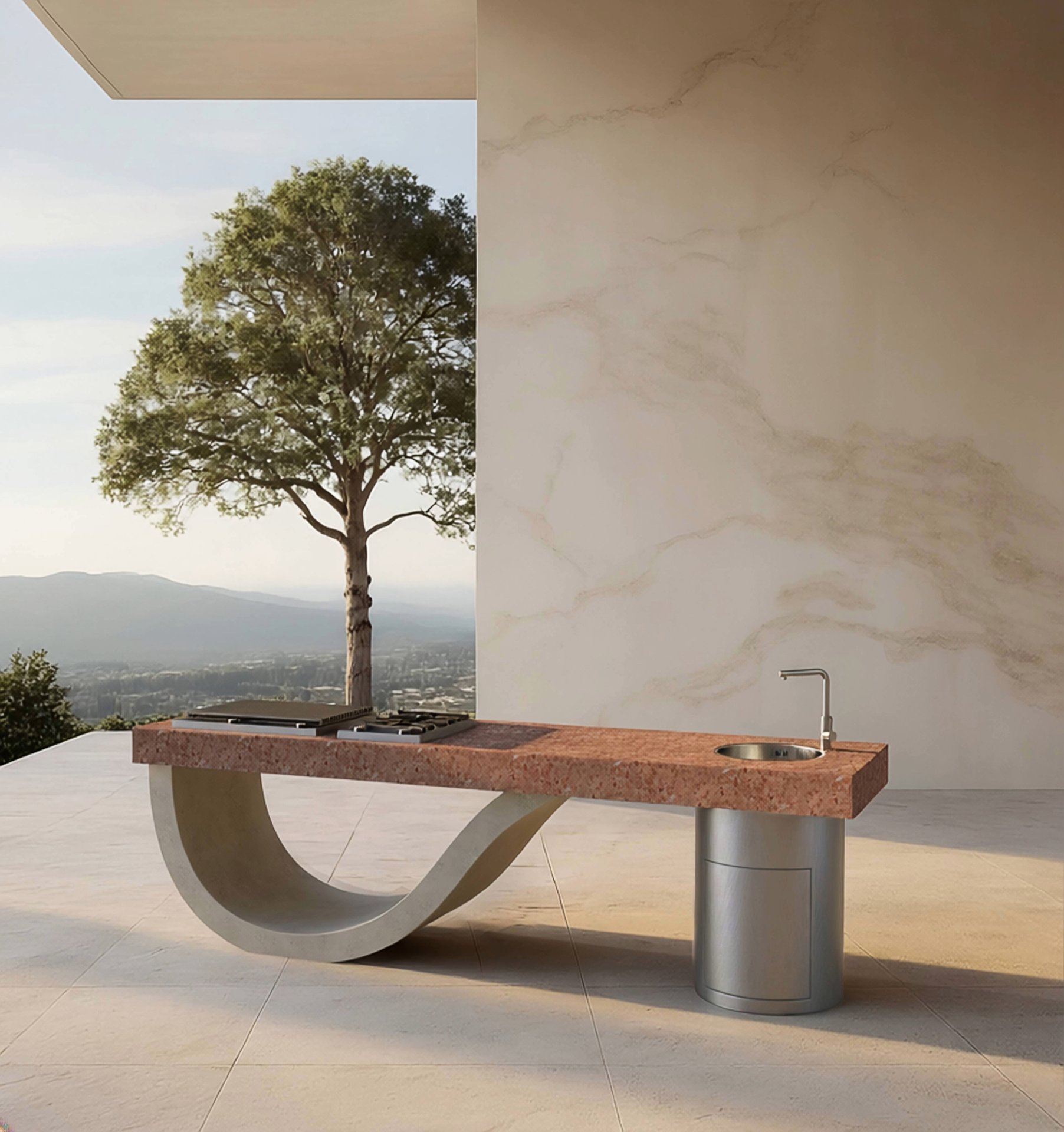 Gli interni e la terrazza affacciata sulla strada sono trattati come un ambiente continuo, in cui arredi, illuminazione e sistemi cucina sono integrati all’interno di una struttura architettonica appositamente progettata. Una palette di cemento colato, acciaio inox, vetro, porcellana e tessuti definisce l’esposizione, applicata a elementi strutturali, superfici e pezzi su misura per creare un’identità materica chiara e coerente tra spazi interni ed esterni. Una cucina scultorea da esterno in cemento colato rappresenta l’elemento centrale della terrazza, evidenziando l’approccio architettonico di Sperlein alla vita all’aperto.