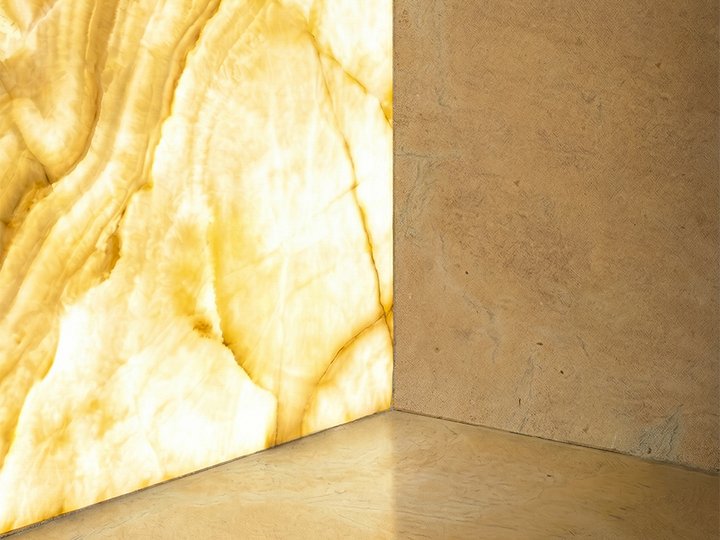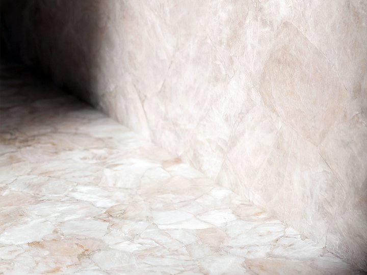 Realizzata nel sottosuolo di una villa storica, guida i visitatori in un percorso immersivo dove la pietra diventa struttura, superficie e atmosfera. Protagonista è la Santafiora®, marmo italiano dalle tonalità calde che definisce l'identità dello spazio.