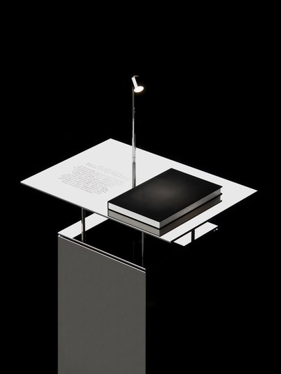 La mostra, con un’installazione progettata dallo studio milanese di architettura studioutte, si svolge presso lo showroom JIL SANDER nel centro di Milano dal 20 al 24 aprile 2026. Leggii cromati si allineano in file, ognuno illuminato da un caldo fascio di luce per la lettura, i loro riflessi restituiti da una parete a specchio. Uno spazio pensato per il piacere di osservare da vicino, di muoversi da un titolo all’altro senza fretta, senza altri luoghi dove essere.